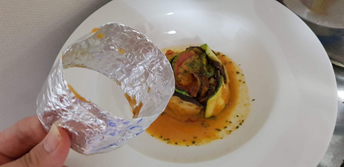 토마토, 가지, 쥬키니, 애호박을 가능한 한 얇게 단면으로 잘라준다(2~3mm). 최대한 얇게 잘라주어야 플레이팅할 때 이쁘다.