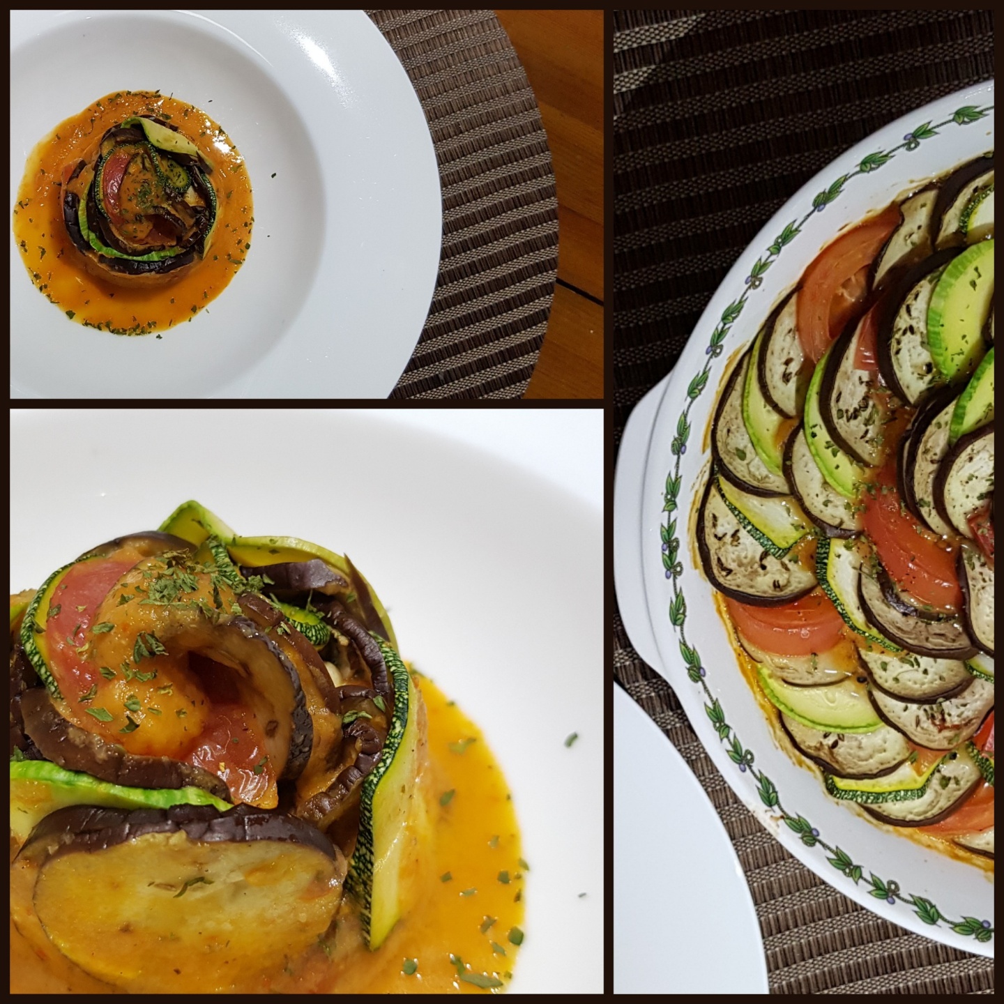 이 요리는 비건이 높게 평가ㅡ 잘라둔 채소를 알록달록하게 빙 둘러가며 깔아주어야 위 사진처럼 느낌 있게 나온다. 난 토마토-가지-쥬키니-가지 순으로 깔았다.